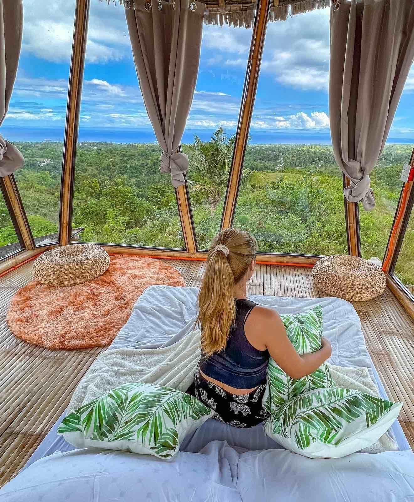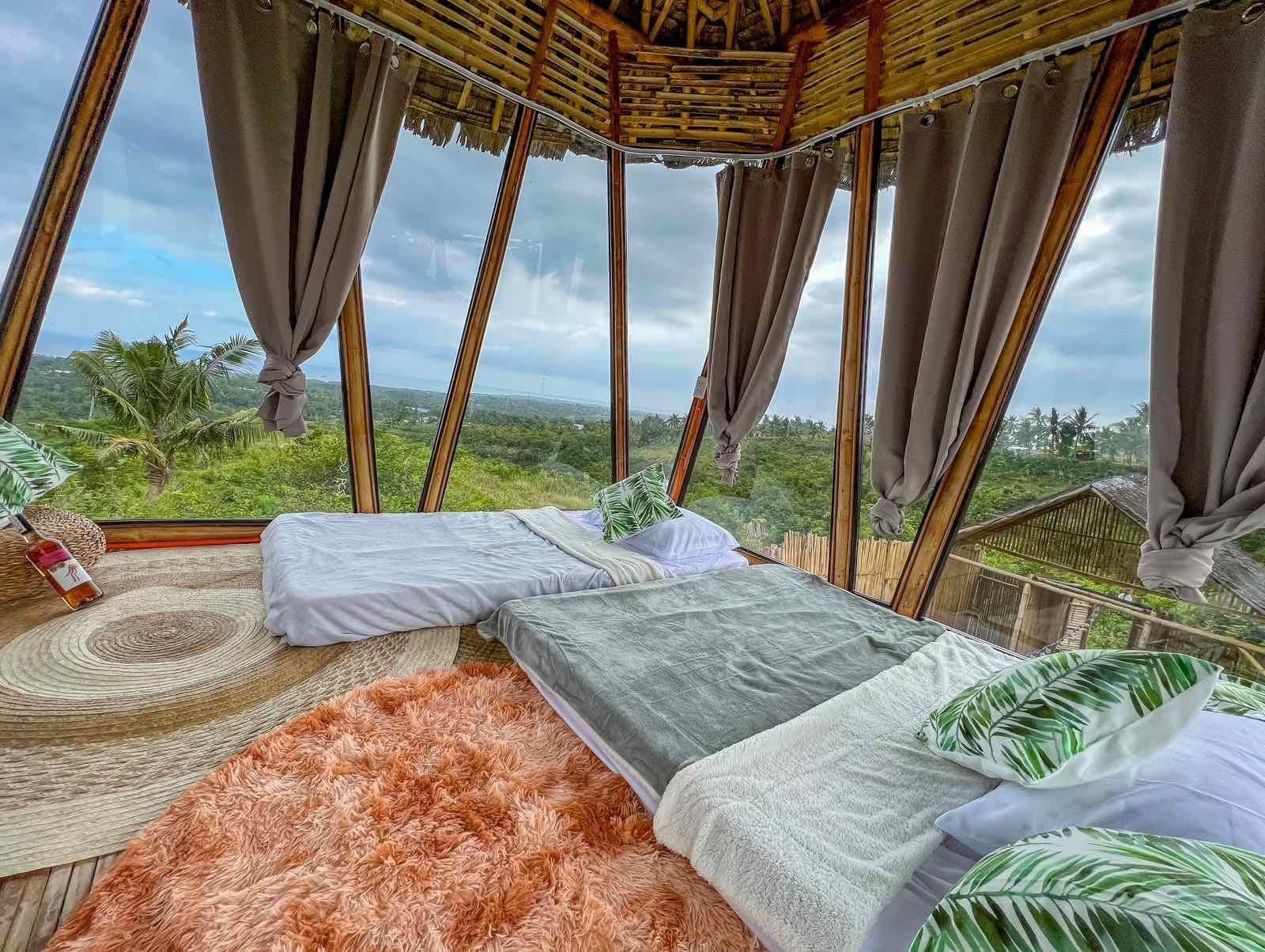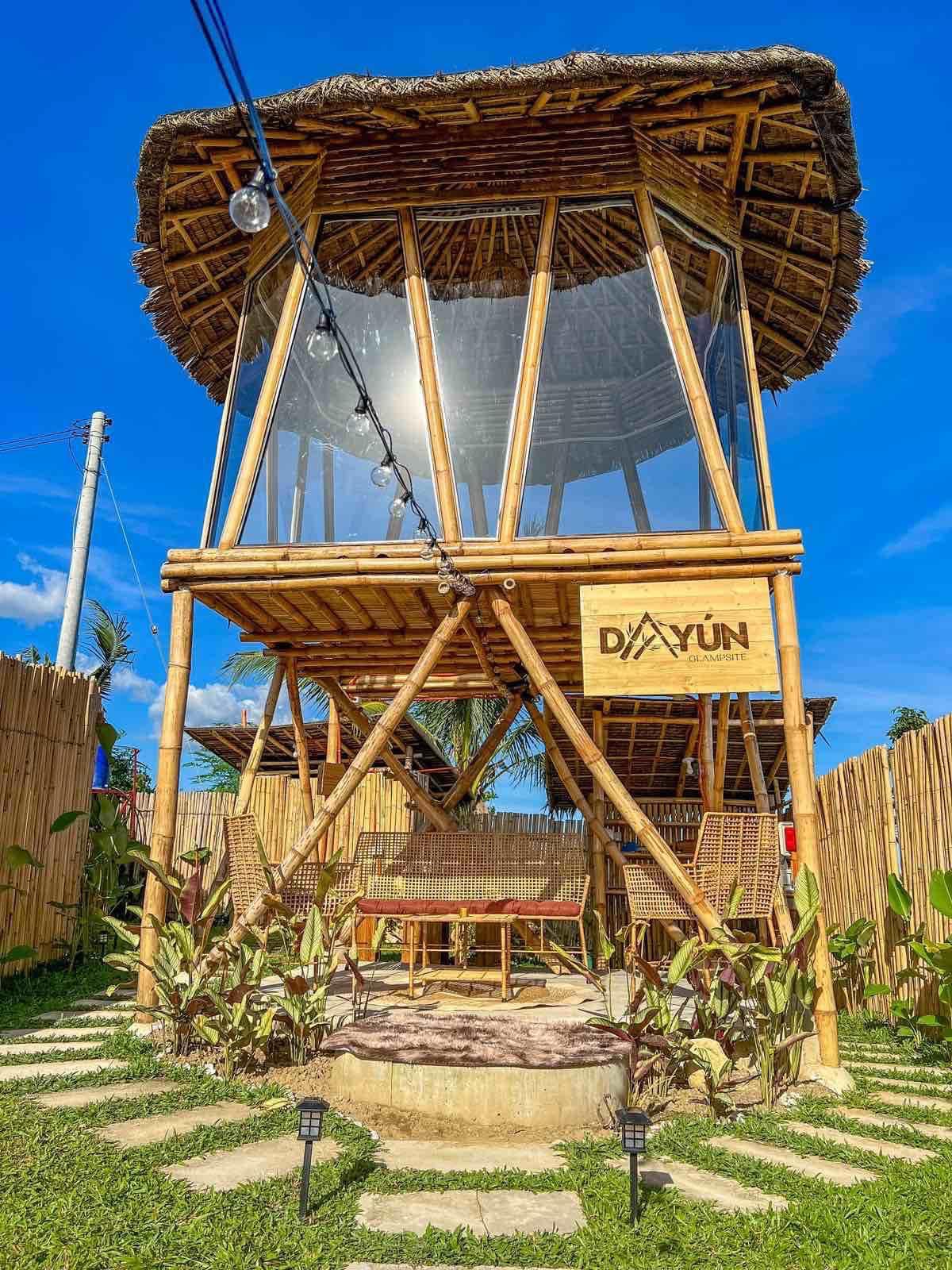 Dayún Glampsite highlights its fantastic glass glamping tent with its native, rustic, tropical concept. Some nice greenery adds to the spot’s relaxing vibe. Soft and mellow music welcomes the guests, which is so homey!